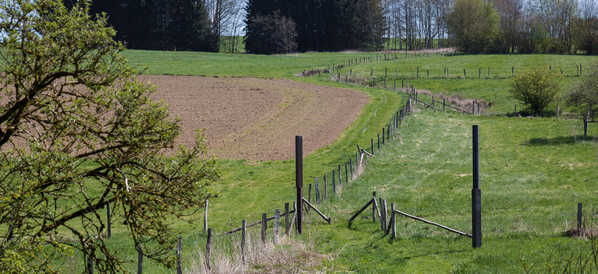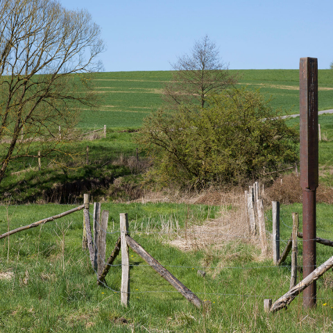 Wie vom Künstler schon sehr früh geäußert, geht es ihm in seinen Arbeiten um »Beziehungen zwischen Bezeichnungen und dem (Bedeutungs-) Umraum«4. Ansgar Nierhoff erschafft durch seine Setzungen (die beiden Eisenstreckungen) einen Ort in der Landschaft und macht diese erfahrbar. Dabei geht er sehr vorsichtig vor: »Man kann/darf nicht gegen Landschaft angehen.«5 Geschärft im Sehen und in der Wahrnehmung betrachtet der Mensch nicht nur den Ort der Skulptur; in der Talsenke stehend wird das bezeichnete Gebiet zum erfahrbaren Mittelpunkt, der geradezu einlädt, rundum in die Landschaft zu spähen. Vollkommen neue Landschaftserlebnisse bieten sich dem Blick an: Die Sicht nach Süden orientiert sich an den beiden Stelen, ferne Bergrücken umfangen die künstliche Form. Eine weiter weg liegende, bewaldete Kuppe wird optisch als korrespondierende Fläche zur Eisenstreckung gelesen; es ergibt sich ein Spiel von flächig wahrgenommenen Hügelformen, die Landschaft schrumpft auf Papiertheaterräumlichkeit. Mit jedem Schritt des Betrachters ändert sich die Szenerie. Eine der Eisensetzungen stößt gar aus der Kontur der Landschaft hinaus, das obere, runde Eisenstück scheint sich himmelwärts zu schrauben, während das Pendant der anderen Stele von der Last des oberen Pfeilerstücks in den Boden gerammt scheint. Man meint, Bewegung zu verspüren – und weiß doch: beide Streckungen gleichen sich in Maß, Proportion und statischer Aufstellung.