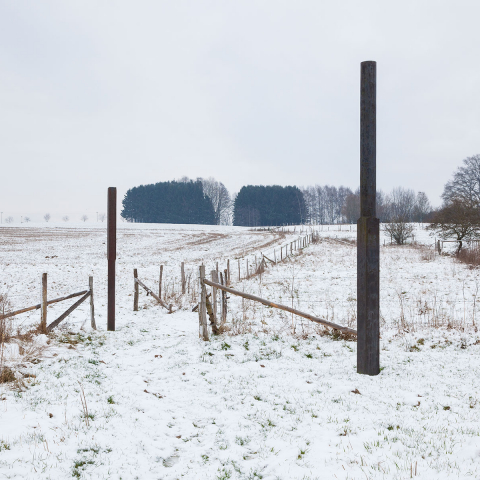 Wie anders präsentiert sich beim Herumlaufen der Blick in die entgegengesetzte Himmelsrichtung, zur kleinen Landstraße hin: Die perspektivische Verkürzung der hinteren Stele scheint extrem, aber die jeweiligen mittleren Absetzungen bilden überraschenderweise ein Niveau. Die waagerechte Achse zwischen beiden ist leicht assoziierbar und läßt an Horizont denken, an eine Gerade, die Himmel und Erde trennt. Doch die rundum gemachten Erfahrungen, das Erleben der sich ständig ändernden und wechselseitig abhängigen Beziehung, belehren den Betrachter eines Besseren: Bei der Horizontalen kann es sich nur um eine Vorstellung, ein Ideal handeln. Vorstellung und Wirklichkeit werden als nicht übereinstimmend vorgeführt.