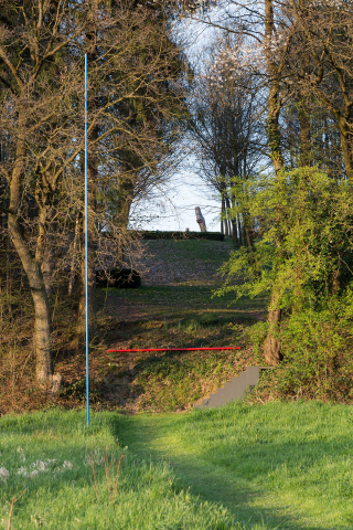 Die elf Meter hohe blaue Senkrechte zeigt sich als unmittelbares Pendant zu den Bäumen. Ihre Farbe nimmt das Blau des Himmels auf. Darüber hinaus signalisiert die blaue Senkrechte eine besondere Aufmerksamkeit für den bestimmten Ort – für den Einstieg in den Rundweg durch das Skulpturental. Eine rote Waagerechte liegt auf der Anhöhe der Schneise, deren Breitenausdehnung sie nachzeichnet. Als Farblinie korrespondiert sie weniger mit ihrem Umraum und bildet eine stärkere Autonomie gegenüber ihrer Umgebung aus, während sie diese als Linie direkt aufnimmt.