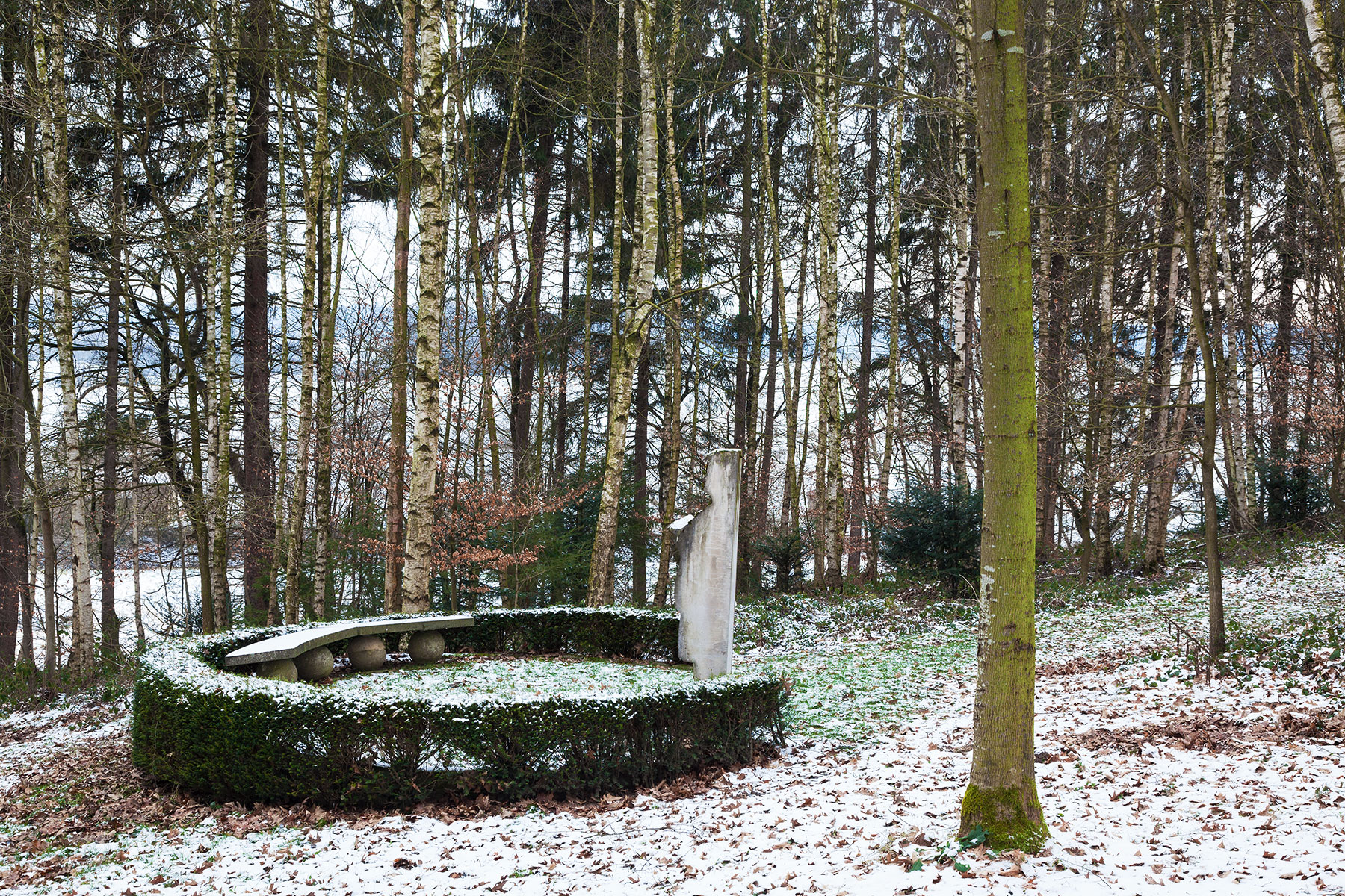 ›Im Tal‹ inmitten ihrer konkreten landschaftlichen Umgebung bleibt diese ästhetische Reflexion ein mögliches Thema der Skulptur, die unmittelbare Wirkung des ›vielseitigen‹ Standbilds zielt auf die räumliche Orientierung des Betrachters. Im Gegensatz zu einer homogenen figürlichen Außenplastik, die selbst dann, wenn sie den Betrachter zur Bewegung auffordert, als integrative Einheit die Wahrnehmung bündelt, herrscht hier der Eindruck des Disparaten, der durch die Gestaltung des Plateaus noch verstärkt wird. Als scheinbar souveränes Denkmal beherrscht die Skulptur ein mit Eiben eingefaßtes kreisförmiges Areal. Doch das, was sich in dem Rund aufeinander beziehen müßte, beachtet genausowenig die Regeln solch einer Platzanlage, wie sich die einzelnen Aspekte der Skulptur zu einer anschaulichen Einheit zusammenfügen. Die Skulptur steht exzentrisch und nimmt daher innerhalb der Grundfläche keinen idealen Standpunkt ein. Die aufgestellte Steinbank, die mit ihren Kugelfüßen barocke Formen zitiert, richtet sich auf keine ihrer Ansichten, sie steht weder axial zur Vorderansicht noch reicht sie weit genug, um von ihr aus eine der beiden Profilfiguren zu überschauen. Die Funktionslosigkeit des vermeintlichen Ruheortes erhöht die Rastlosigkeit des Vorbeikommenden, dem sich die Gesamterscheinung nur durch eine sukzessive Auseinandersetzung mit Einzelaspekten erschließt. Er kann sich entweder mit der Männerfigur oder mit der Frauenfigur in Beziehung setzen, niemals mit beiden gleichzeitig. Obwohl deutlich erkennbar ist, daß die beiderseitigen Profillinien im Relief der Vorderansicht ineinanderfließen, ergibt sich aus dieser Synthese eine unbestimmte, anonyme Gestalt, die keinerlei Verbindung herstellt. Gänzlich unabhängig von den seitlichen Darstellungen besitzt ihre seltsame Unergründlichkeit etwas von der Suggestionskraft einer fremdländischen Kultfigur. Durch die Vereinzelung der Ansichten verliert der Platz die Funktion eines intimen Aufenthaltsortes, der sich auf die gesammelte Anschauung eines Denkmals ausrichtet. Der offene Charakter des umschlossenen Platzes wird ebenso dadurch manifestiert, daß er sich als Ausgangspunkt für außerhalb liegende Blickpunkte eignet. Der wichtigste Punkt ist sicher die zweite Skulptur des Ensembles, die der ersten höherstehenden vom Aufbau her genau gleicht. Während man die Eingegrenzte aus der Nähe betrachtet, kann die andere, die im Vergleich zu jener einsam und ungeschützt am Schneisenrand steht, nur aus der Distanz beäugt werden. Nahsicht und Fernsicht werden auf exemplarische Weise alterniert. Der Blick vom Plateau trifft wieder auf eine Dreiviertelansicht, die einsehbare Seitenansicht zeigt diesmal einen Männerakt ohne anekdotische Details. Aus der Entfernung wird sogar eine punktuelle Zusammenschau der getrennten Profilfiguren möglich. Es stellt sich ein anamorphotischer Effekt ein, wenn der Männerakt über die im Relief der Vorderansicht stattfindende Verwandlung sichtbar in eine weibliche Profillinie übergeht. Der ideale Standort für diese Sicht ist nicht gesondert gekennzeichnet er ist ein möglicher unter vielen.