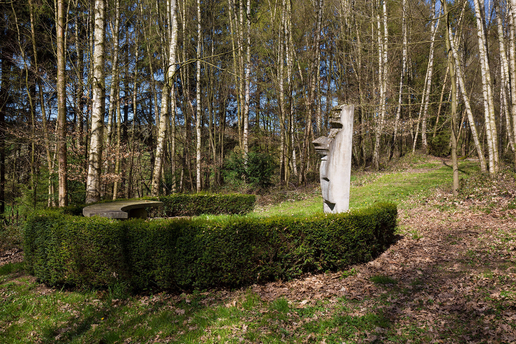 Am Rande der Laubwälder, die rechts und links die große Schneise säumen, stehen zwei figürliche Plastiken von Marin Kasimir. Beim Anstieg zum Mühlengraben rücken beide zum ersten Mal ins Blickfeld. Ihre strenge Pfeilerform erinnert an antike Hermen, Kultmale, die ursprünglich an Flurgrenzen, Wegkreuzungen oder Landstraßen aufgestellt wurden. Die einsehbare Seitenansicht der näherstehenden gibt eine schemenhafte Frauengestalt zu erkennen. Wenn der Besucher des ›Tal?s‹ nach zwei Dritteln seines Rundgangs das »Haus für August Sander« hinter sich läßt und an der Arbeit von Bogomir Ecker vorbei einen kleinen Pfad weitergeht, trifft er recht unvermittelt auf eine Art Plateau und steht plötzlich einer der beiden Skulpturen direkt gegenüber. Dem Ankommenden begegnet sie im Dreiviertelprofil und zeigt die Silhouette eines Mannes, der ein Buch in der Hand hält. Da die Gestalt allein durch ihre vordere Umrißlinie bezeichnet wird, wirkt die Abbildung wie ein graphischer Entwurf, der sie aus dem rückwärts geschlossenen Pfeiler herauslöst. Der Beton, aus dem die Arbeit gefertigt ist, erzeugt eine glatte hermetische Oberfläche. Entsprechend der nicht gestalteten Rückfront erwartet der Betrachter, daß nun eine frontal ausgerichtete Schauseite folgt, eine Hauptansicht, in der sich die fl ache Seitenansicht räumlich konkretisiert. Die Annahme, hier einer dargestellten Person gegenüberzutreten, erweist sich jedoch als voreilig. Das Relief, das sich aus den Konturlinien des Seitenaufrisses heraus entwickelt, gewinnt keinerlei rundplastische Form. Die Vorderansicht bleibt somit seltsam unbestimmt. Geht man weiter um die Statue herum, sorgt die zweite Seitenansicht für einen neuen Aspekt. Der Stein zeigt nun das Profil einer Frauenfigur.