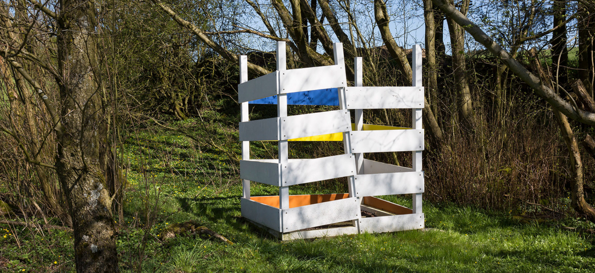Die Natur im Tal ist Land, Land das bewohnt und beackert wird, das daliegt, manchmal gefressen wird, manchmal betrachtet, nur selten gemäht. Land, das naß wird und Landschaft, in der Kunst heimisch werden kann. Aber was macht das Haus, das kein Haus ist, mit seiner Umgebung? Ein bißchen sieht es ja aus wie eine Zeichnung, wie eine ins Dreidimensionale erweiterte Skizze von einem Haus, wie eine Idee. Oder wie der Geist eines kleinen Hauses. Es scheint nur aus Umrißlinien zu bestehen. Ein senkrecht stehendes Eisengerüst, Hölzer, Steinplatten. Gebaut aus alltäglichen, gebräuchlichen Materialien und in der Konstruktion geometrisch klar. Selbst als Einzelstück hat es etwas Serielles. Die horizontal verlaufenden Bohlen sind außen weiß, innen wechselnd farbig. Sie frieden in offener Wandstruktur ein nicht begehbares Inneres ein.