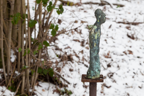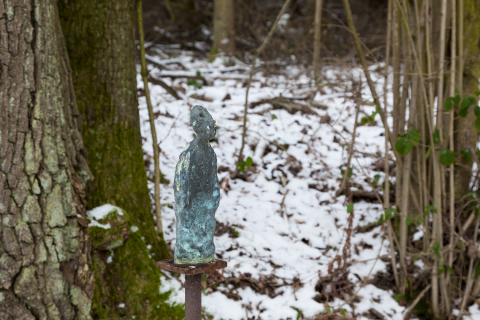 Die Bronzeplastik »Armer Mensch« von Thomas Lehnerer im ›Tal‹ provoziert in ihrem überraschenden Auftauchen am Ende eines schmalen Pfads die Reflexion von Standort und Weg. Beides ist für das Verhältnis der Plastik zur umgebenden Natur maßgeblich und begründet die spezifische Atmosphäre am Ort. Vorherrschend hier ist eine meditative Stille, auf die der hinführende Weg des ehemaligen Mühlengrabens vorbereitet. Zudem bestimmend ist eine große Eiche, die sich am Wegrand oberhalb des tiefer gelegenen Tals gegen die Weite der Landschaft abhebt. Vor ihrem Stamm ist die Plastik platziert. Es handelt sich dabei um eine kleine, auf einem Metallstab aufgesockelte Bronzefigur.