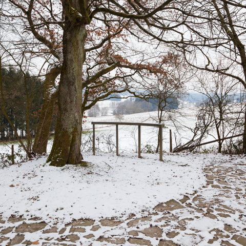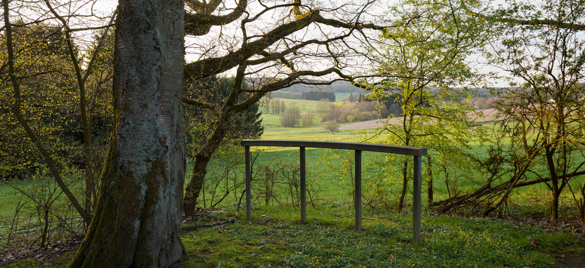 Der höchste Punkt des zum ›Tal‹ gehörenden Geländes zeichnet sich bereits durch besondere Gegebenheiten aus, die natürlich wie künstlich sind. Da gibt es einen alleinstehenden, von weitem sichtbaren alten Baum und einen Durchfahrtsweg. Beide integriert und involviert Wolfgang Luy symbolhaft in seine Arbeit. Gedanklich wie formal sind sie Schlüsselelemente, an deren Bedeutungen Luy anschließt und um die er im wahrsten Sinne des Wortes Kreisfiguren legt. Dieselben sind real und imaginär und durchdringen sich mit ihren jeweils anders gelagerten Zentren und Achsen gegenseitig. Das Kunstwerk ist kaum als solches auszumachen, will als dieses allein auch nicht verstanden werden. Vielmehr liefert es Angebote, die den Betrachter zum Akteur werden lassen. Er wird, ohne es möglicherweise vorerst zu bemerken, zum ebenfalls thematisierten Bestandteil der Skulptur. Diese ist als ein Platz mit unterschiedlichen Bedingungen und Erlebnishorizonten ausgewiesen. Die Möglichkeit, auf die plastischen Denkvorgaben zu reagieren, sie aufzugreifen, weiterzuspinnen und auf sich bezogen zu erfahren, steht jedem frei.