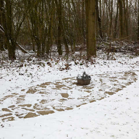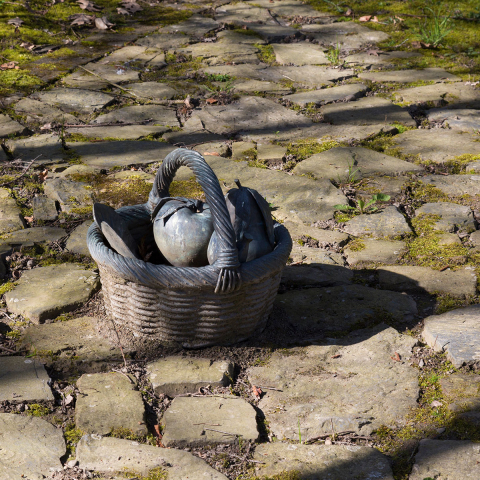 Den Betrachter abermals einen anderen Standpunkt einnehmen lassend, steht auf der gegenüberliegenden Seite des Weges, der den ansonsten mit Natursteinen bepflasterten Platz kreuzt, ein bronzener Korb voller Früchte und Blätter aus Bronze – wie zufällig abgestellt, vergessen. Ein industriell gefertigtes, die Natur nachahmendes Stilleben, das Lebendiges einfriert. Es ist ein Bild, das über die Imitation von Realität berichtet. Als solches verweist es nicht nur auf die durch Handeln erwirkte Normalität und Autonomie der Dingwelt, sondern darüber hinaus auf die Tatsache, daß Naturprozesse jeglicher Art – von der Pflanze bis zum Menschen – bereits technisch reproduzierbar sind. Daß vor diesem sich bewußt zu machenden Hintergrund ein zeitgemäßes, direktes Gespräch zwischen Mensch und Natur aufgenommen werden kann, schließt Wolfgang Luy nicht aus. Vielmehr fordert er etwas heraus, das, mit seelischer Erlebensqualität umschrieben, die Begegnung mit Natur wie mit Kunst für den Menschen beherbergen kann. Dieses Etwas geht über Sentimentalität und touristischen Erholungswert von Landschaft ebenso weit hinaus, wie über ein ästhetisches Vergnügen. Entwickeln kann es sich allerdings erst aus einem reflektierten Mit- und nicht aus einem Gegeneinander.